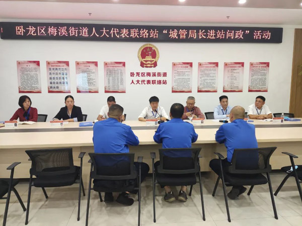 南阳市卧龙区梅溪街道人大代表联络站开展“城管局长进站问政”活动。