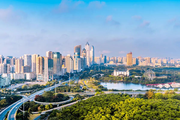 海南海口国贸CBD和滨海立交桥高视角建筑风光。来源:视觉中国
