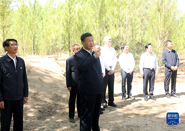 6月5日至6日,中共中央总书记、国家主席、中央军委主席习近平在内蒙古巴彦淖尔考察,并主持召开加强荒漠化综合防治和推进“三北”等重点生态工程建设座谈会。这是6日上午,习近平在临河区国营新华林场考察。新华社记者 谢环驰 摄