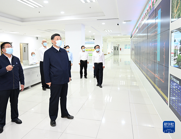 6月5日至6日,中共中央总书记、国家主席、中央军委主席习近平在内蒙古巴彦淖尔考察,并主持召开加强荒漠化综合防治和推进“三北”等重点生态工程建设座谈会。这是6日上午,习近平在河套灌区水量信息化监测中心考察。新华社记者 申宏 摄