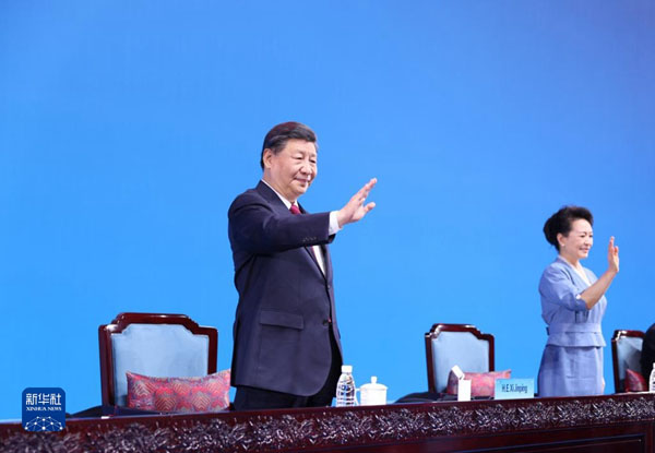 19时58分,在《和平——命运共同体》的乐曲声中,习近平和夫人彭丽媛,同国际大学生体育联合会代理主席艾德等步入主席台,向观众挥手致意。全场响起长时间的热烈掌声。