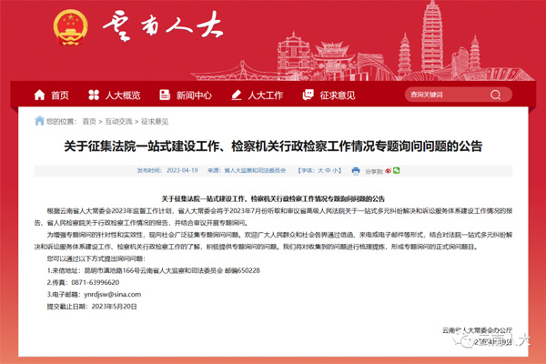云南人大网发布向社会广泛征集关于法院一站式建设工作、检察机关行政检察工作情况专题询问问题的公告。