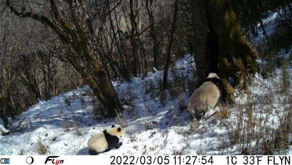 这是2022年3月5日大熊猫国家公园宝兴片区红外相机拍摄的大熊猫母子画面。(四川省雅安市宝兴县委宣传部供图)
