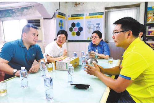 台山市检察院检察长张维良(左)前往绿稻农场,就检察机关服务乡村振兴征求陈奭荣(右)的意见建议。