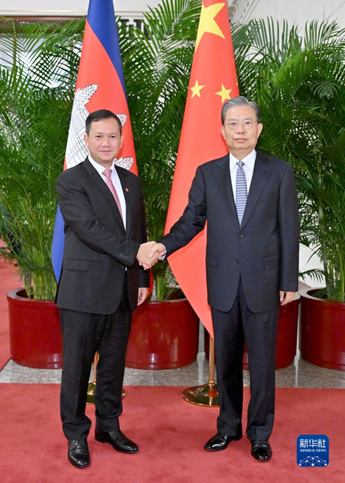 9月15日,全国人大常委会委员长赵乐际在北京人民大会堂会见柬埔寨首相洪玛奈。新华社记者 岳月伟 摄