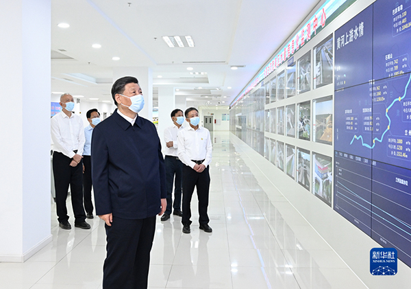 6月5日至6日,中共中央总书记、国家主席、中央军委主席习近平在内蒙古巴彦淖尔考察,并主持召开加强荒漠化综合防治和推进“三北”等重点生态工程建设座谈会。这是6日上午,习近平在河套灌区水量信息化监测中心考察。新华社记者 申宏 摄