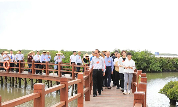 代表们在麻章区金牛岛红树林片区,实地了解红树林分布状况、生长环境和保护情况。