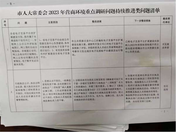 娄底市人大常委会2023年营商环境重点调研问题持续推进类问题清单。