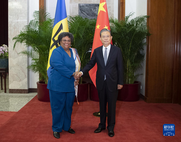 6月27日,全国人大常委会委员长赵乐际在北京会见巴巴多斯总理莫特利。新华社记者李涛 摄