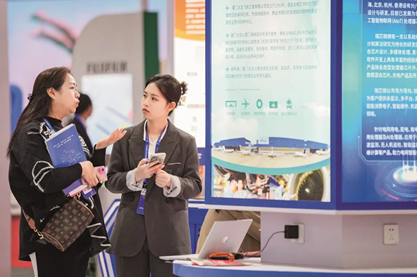 >>第十二届中国国际服务外包交易博览会在武汉开幕。图为3月21日,参展企业工作人员向观众讲解展品。本届博览会围绕“数字新机遇 外包新未来”主题,集展览展示、行业对话、商务交流于一体,全方位展示中国服务外包发展成就。新华社记者 伍志尊/摄