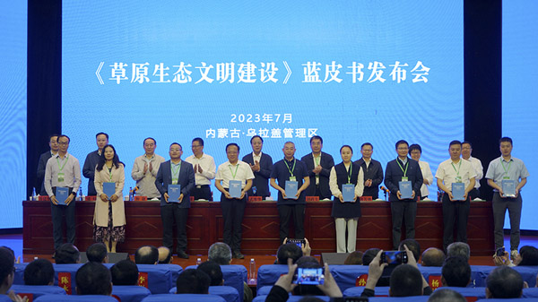 7月7日上午,九三学社中央与国家林业和草原局在内蒙古自治区乌拉盖管理区联合召开《草原生态文明建设蓝皮书(2012—2022)》发布会,向与会代表赠书。