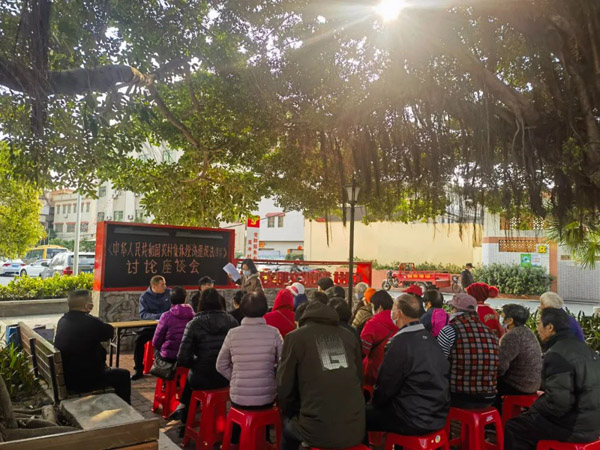 “我们村党群服务中心也有大会议室,但是村民们都不愿意来,”直冲村党委书记、村委会主任郭卫强告诉本刊记者,“后来我们发现村民们喜欢在村委门口的大榕树下活动,干脆就把横幅拉过去,就地征集立法意见。”“地方熟、人也熟,大家没有拘束感,想啥说啥,效果特别好!”