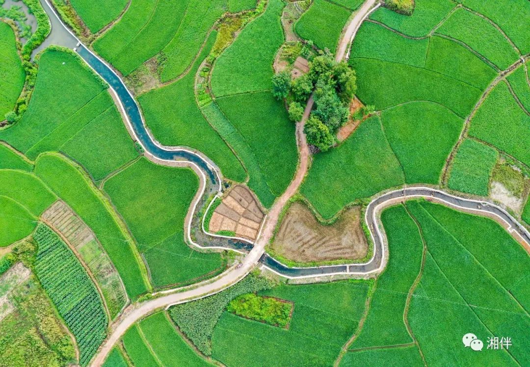 道县富塘街道塘背村,灌溉渠蜿蜒在稻田中。